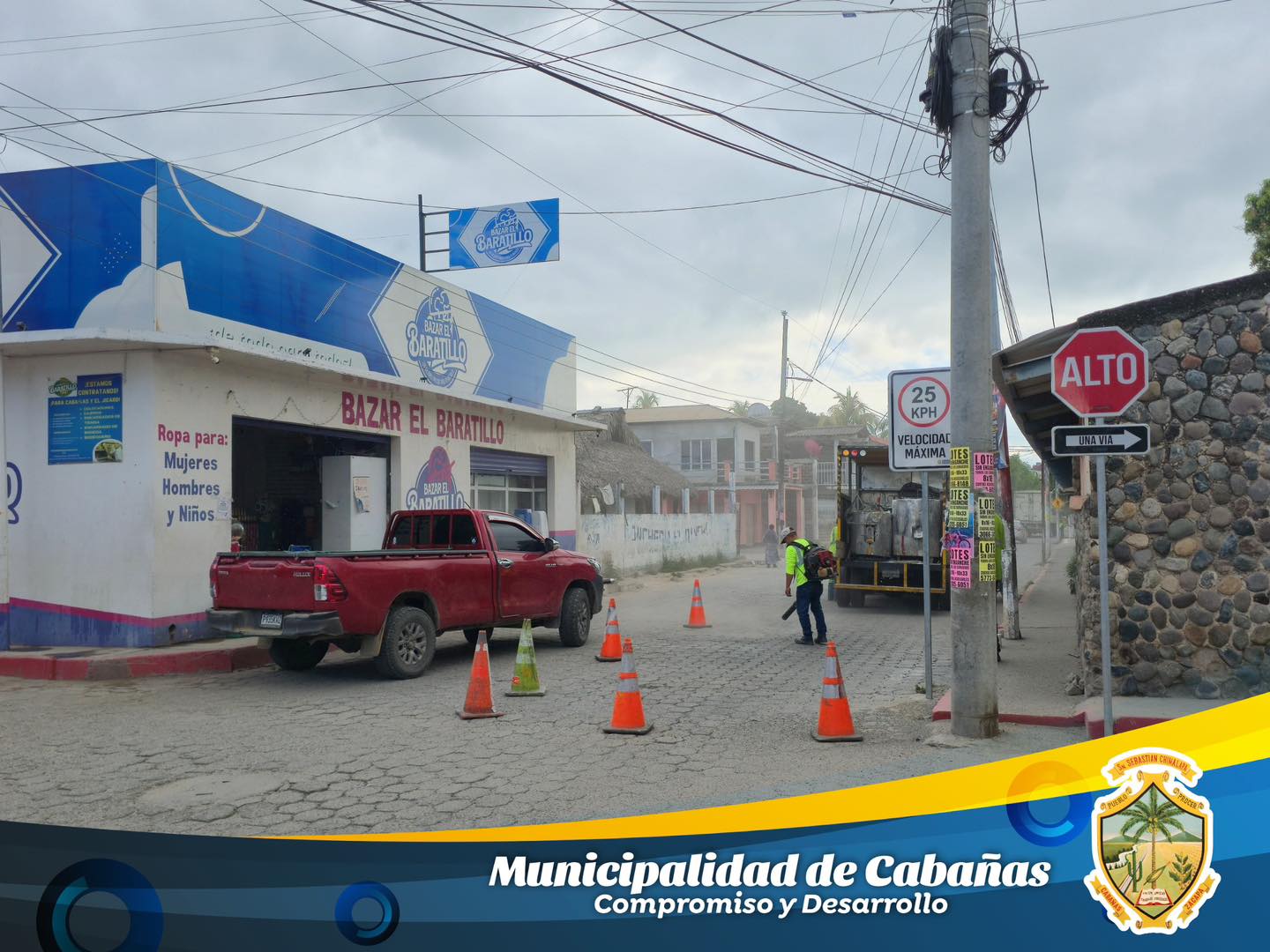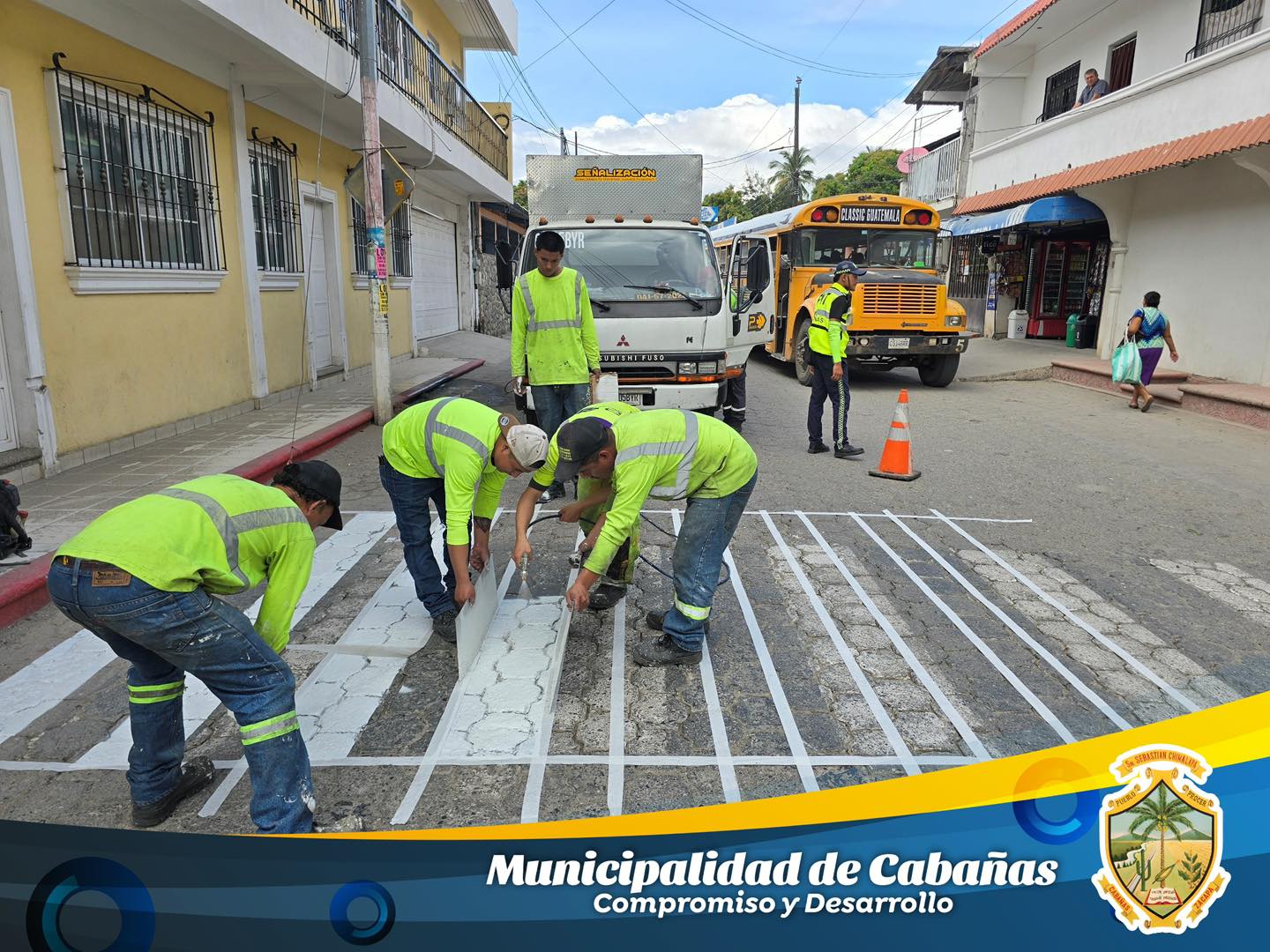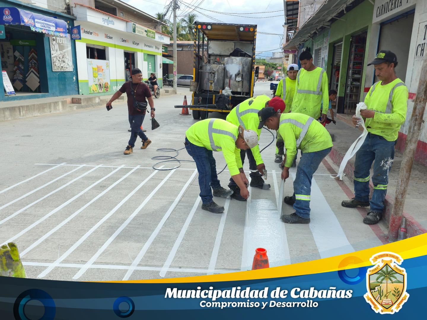 El Departamento de Tránsito, en coordinación con la PMT Cabañas, realiza trabajos de pintura en pasos de cebra ubicados en la calle principal, con el objetivo de mejorar la seguridad vial para peatones y conductores.